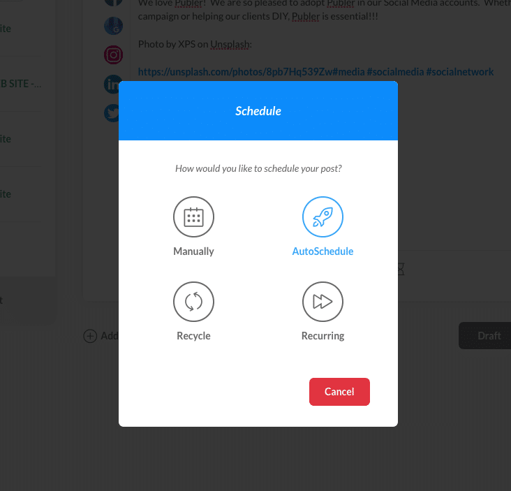 Our favorite is Publer (publer.io). There are many reasons we like Publer and we’ll get into those next: